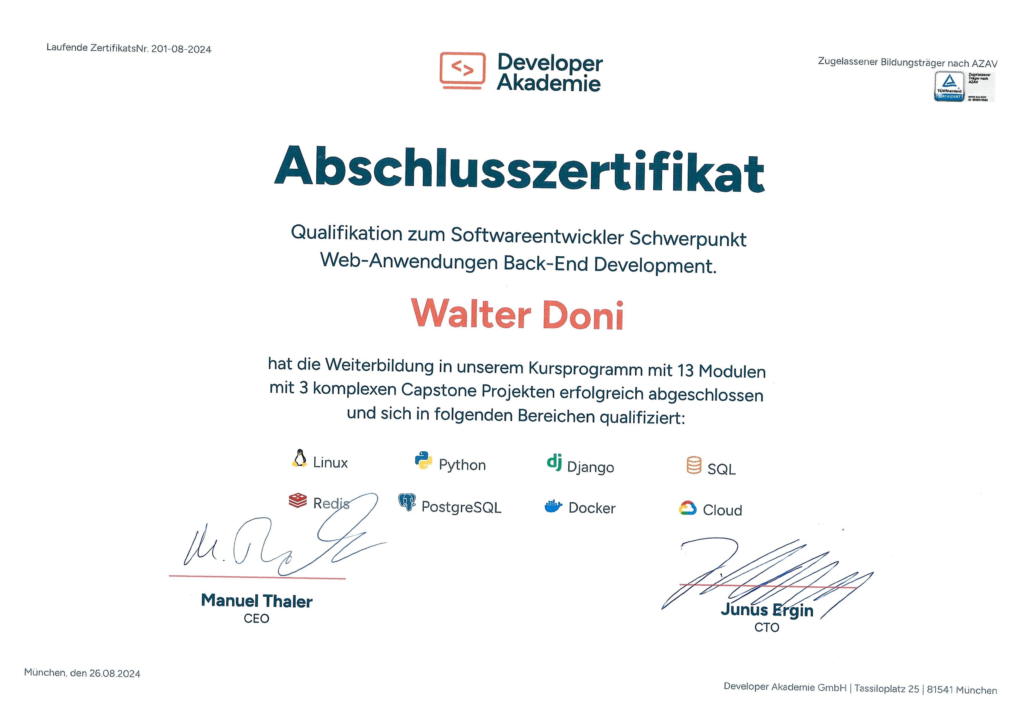 Seit März 2023 konzentriere ich mich in meiner Freizeit und seit Juli 2024 auch beruflich darauf, meine Fähigkeiten in der Webentwicklung zu verbessern. Dabei habe ich mein Wissen und meine Kenntnisse kontinuierlich erweitert – von einfachen statischen HTML-Webseiten bis hin zu komplexen Webanwendungen. Anhand der Projekte kannst du sehen, welche Technologien ich dafür genutzt habe bzw. aktuell nutze.
