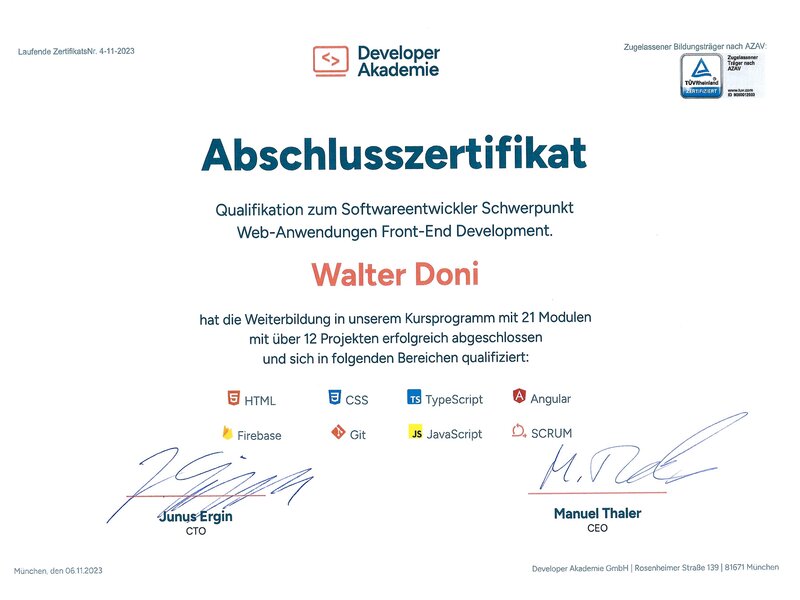 Seit März 2023 konzentriere ich mich in meiner Freizeit und seit Juli 2024 auch beruflich darauf, meine Fähigkeiten in der Webentwicklung zu verbessern. Dabei habe ich mein Wissen und meine Kenntnisse kontinuierlich erweitert – von einfachen statischen HTML-Webseiten bis hin zu komplexen Webanwendungen. Anhand der Projekte kannst du sehen, welche Technologien ich dafür genutzt habe bzw. aktuell nutze.
